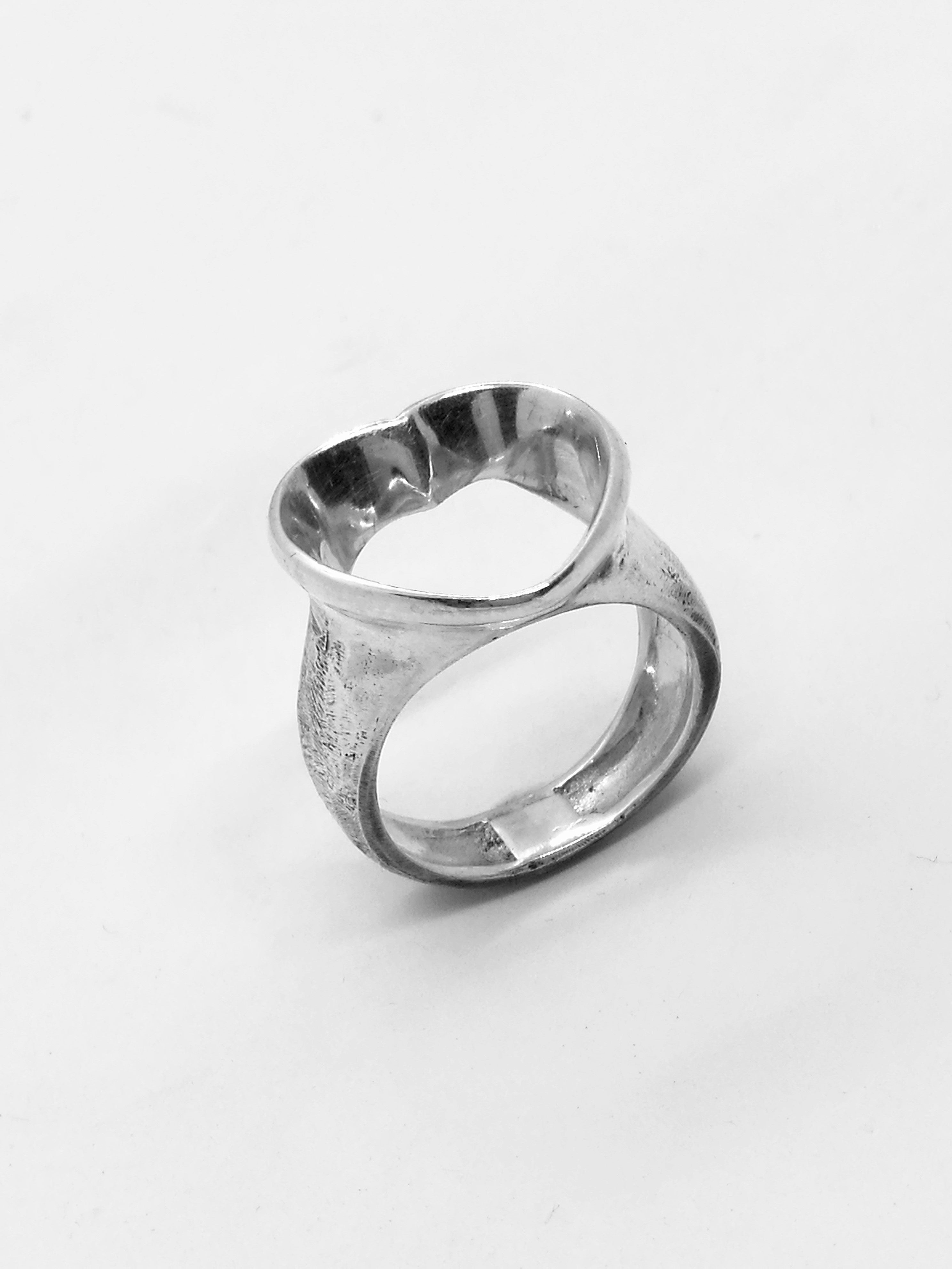 Anello da donna, che esprime carattere e dolcezza al tempo stesso. Realizzato in argento 925°. La particolare rifinitura del gambo, dove volutamente sono stati lasciati i segni della lavorazione artigianale per creare il contrasto con la lucida e luminosa cornice vuota del cuore, simbolo che esprime affetto, sostegno, solidarietà, sorellanza senza la necessità di parole. E' possibile la realizzazione dell'anello tutto lucido.
