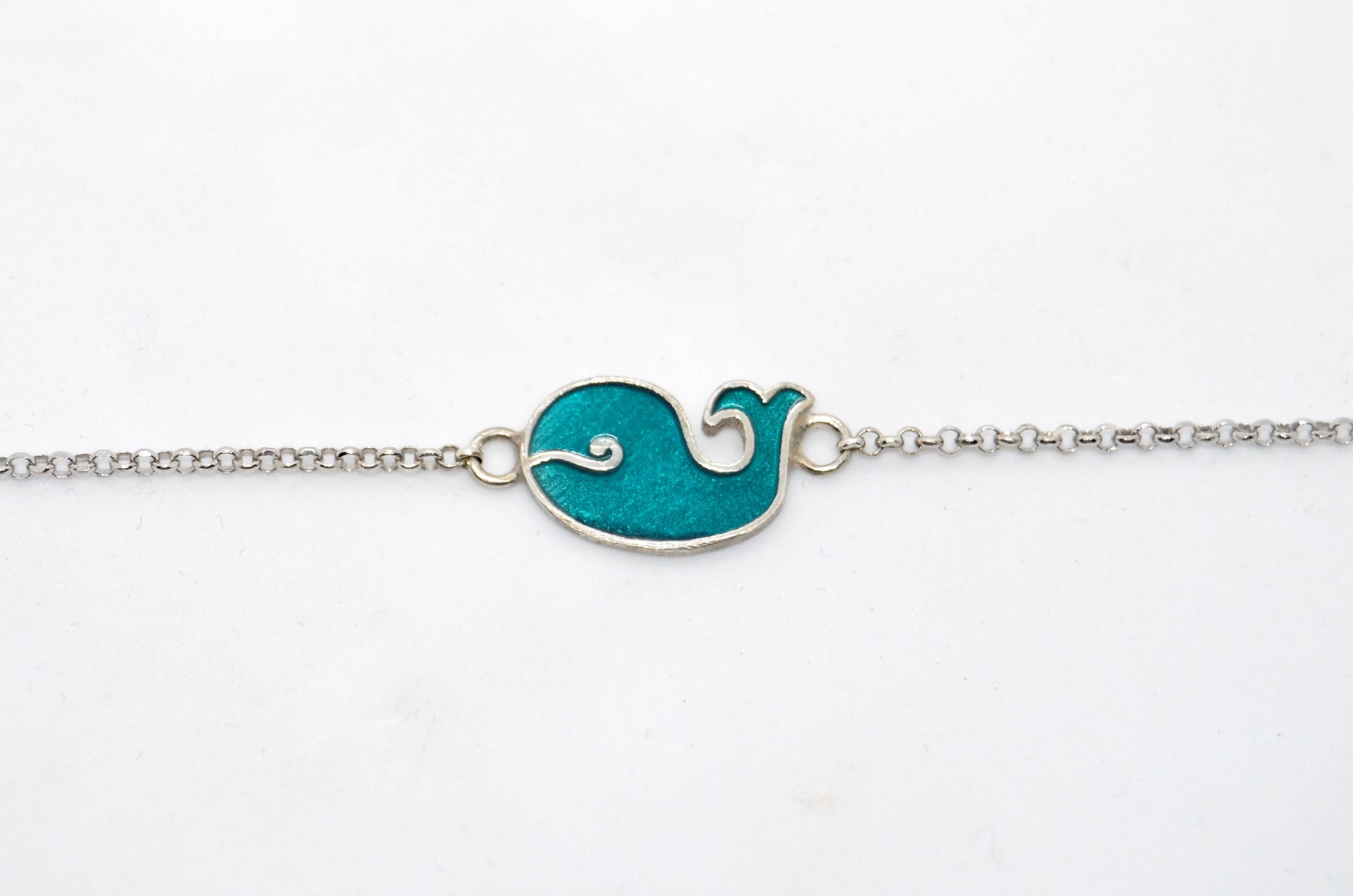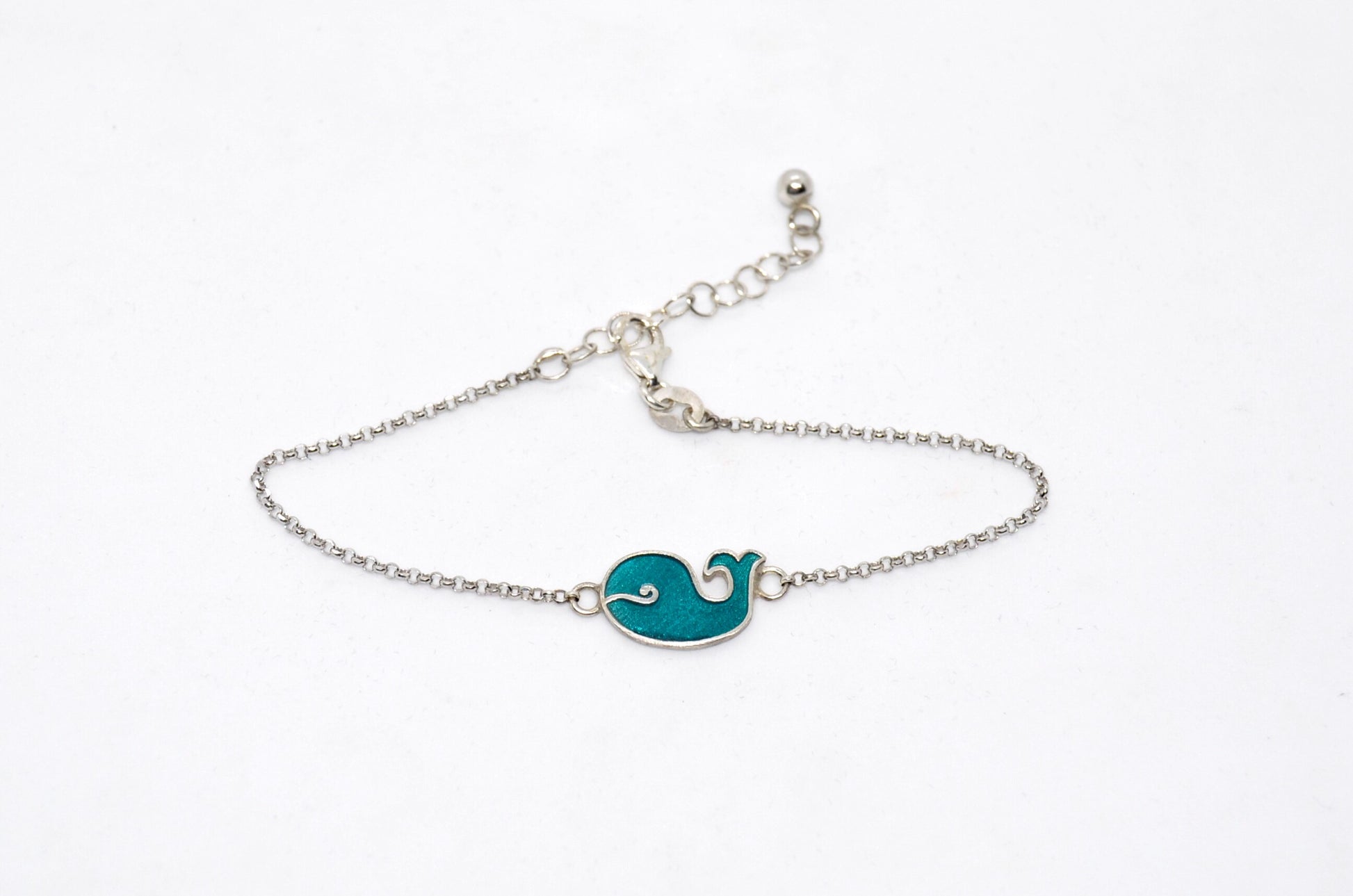 Elegante braccialetto in argento 925° e smalto a freddo da oreficeria a tema marittimo. La protagonista è la balenottera azzurra . Trasparenza dello smalto evoca il colore del mare e il nome del più grande animale conosciuto sulla terra. Un gioiello per tutte le donne, da quelle più piccole a quelle cresciute, purché siano amanti del mare e delle creature che lo abitano, da portare con orgoglio per comunicare l'importanza di salvaguardare gli oceani. Altri colori di balena su richiesta. Per completare il vostro stile marino disponibili gli orecchini al lobo, ciondoli e collanine della stessa collezione Balena Azzura.