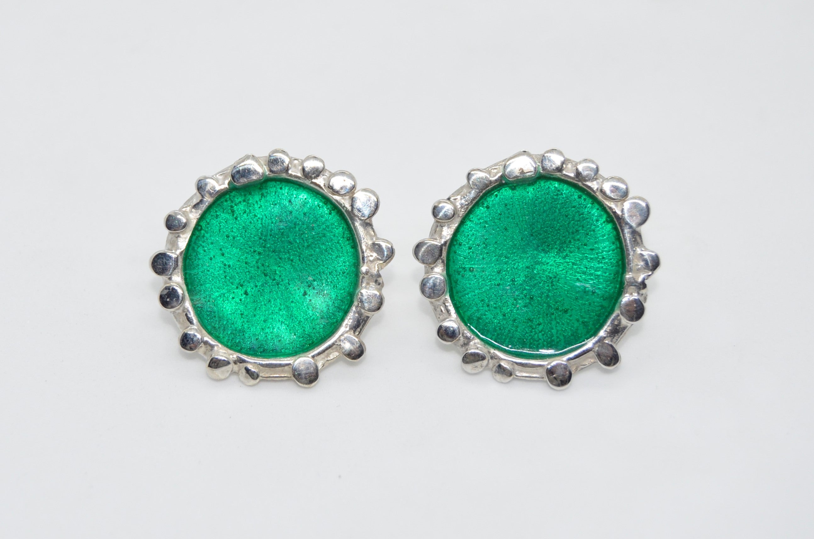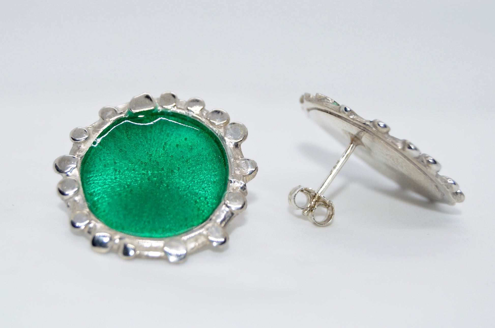 Il colore influenza direttamente l'anima, e questi orecchini Vi doneranno buon umore. Orecchini aderenti al lobo con la chiusura a farfallina, eseguiti in argento 925° e lo smalto a freddo da oreficeria di un colore verde smeraldo brillante e trasparente. Elemento smaltato a forma di un fiore di girasole stilizzato di diametro 2,5cm rende questi orecchini molto decorativi e di sicuro non passeranno inosservati. Nonostante le sue dimensioni sono molto confortevoli e leggeri. Per completare il vostro stile disponibile l'anello. Chiusura a gancetto o a clip su richiesta. Altri colori su richiesta sia per gli orecchini che per l'anello.